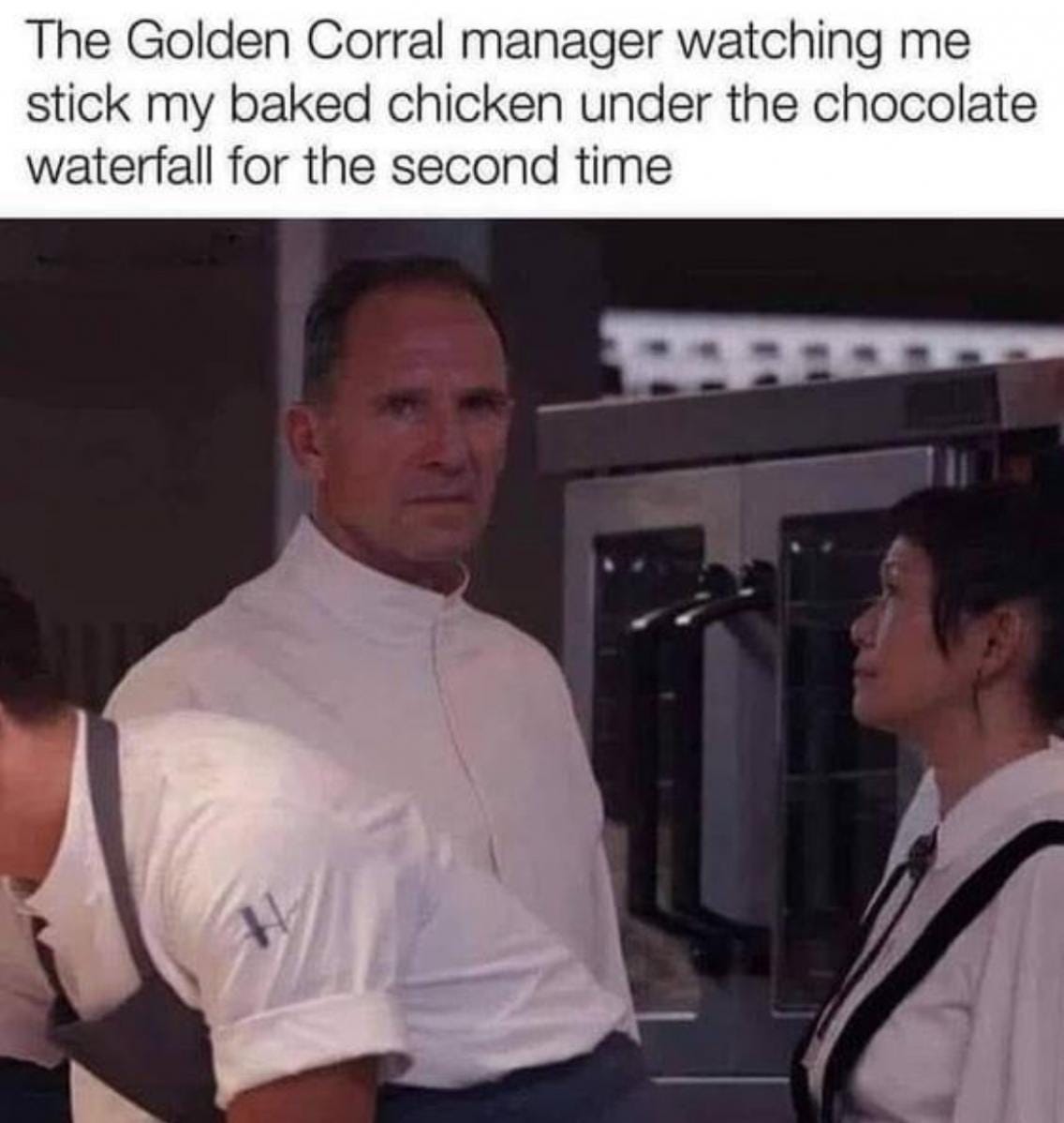 Note to the chefs here amongst us. Putting the chicken under the chocolate fountain is Nahuatl cuisine. In their language the approximate sound is "mōlli" and in Spanish it is often said "molè" and English speakers hear "mole-lay". Chocolate is not from Europe, friends, and chef at Golden Corral can do what the dog on the bus suggests, hey? lol
