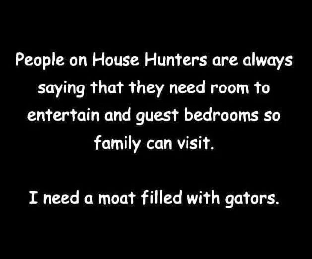I can relate to the “people on House Hunters” meme as quite often, when I come home from work after a bad day, usually I’m in no mood for visitors & I’d rather just spend time with my wife & kids than strangers I barely know & have to “play nice” with them 👎🤨. Rather than a moat with gators, I’d choose to have “Final Destination” type of traps for strangers that I can activate after having a bad day😈😈😈